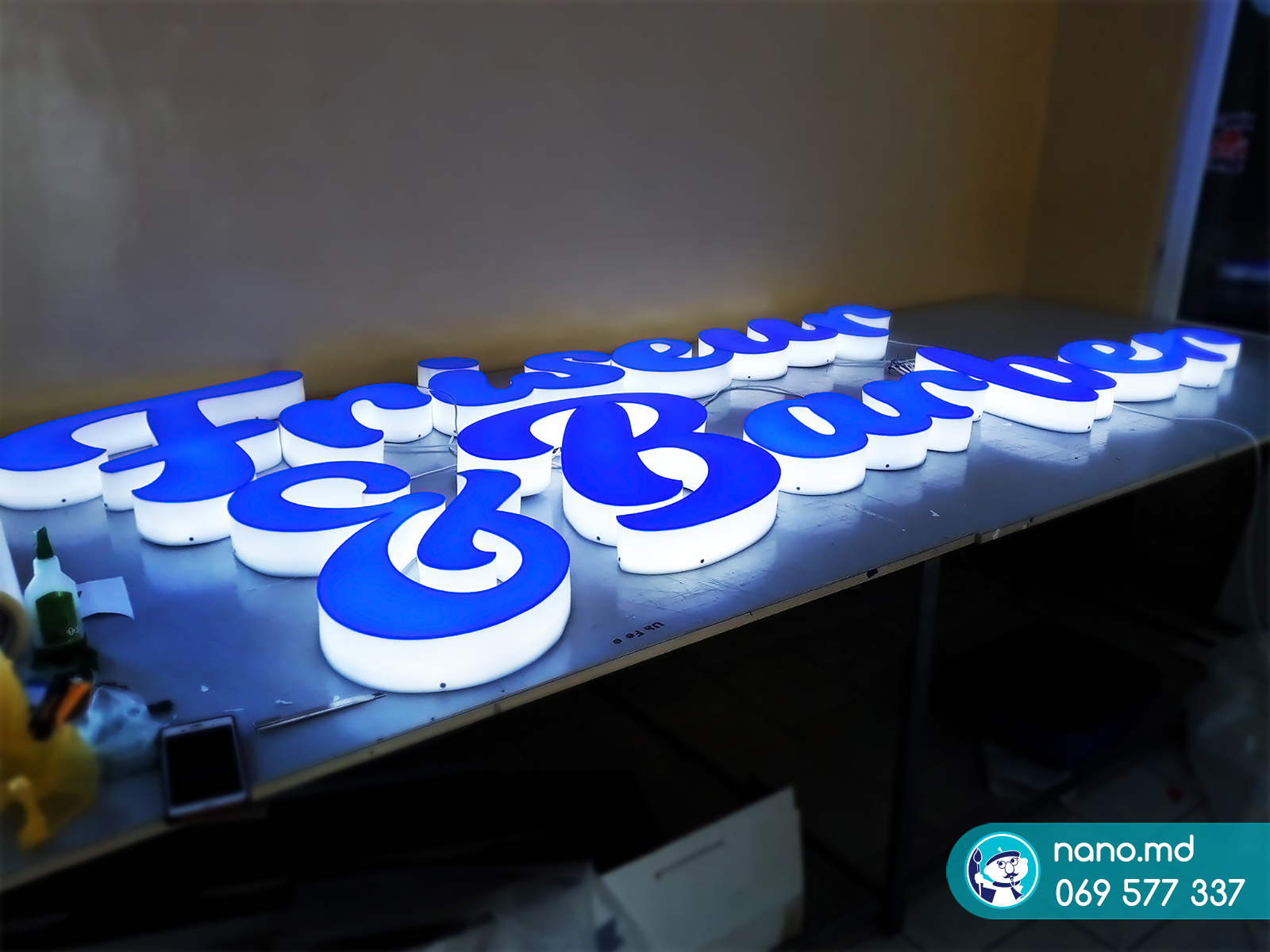 - Producerea literelor volumetrice de diferite culori și fonturi cu opțiuni multiple de aranjament la alegere, inclusiv în stilul corporativ al mărcii;